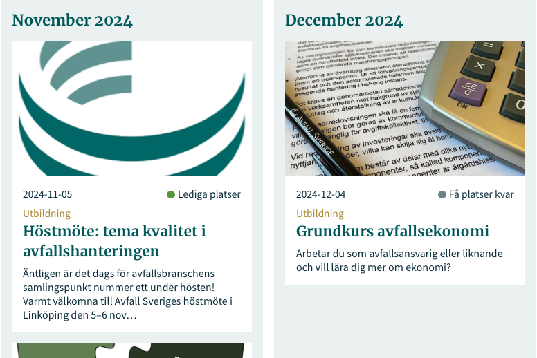 Utbildningar, konferenser, möten, datum för ansökning till Utvecklingssatsningen och andra viktiga händelser som berör Avfall Sveriges medlemmar finns nu samlade i ett kalendarium på avfallsverige.se. Kolla in