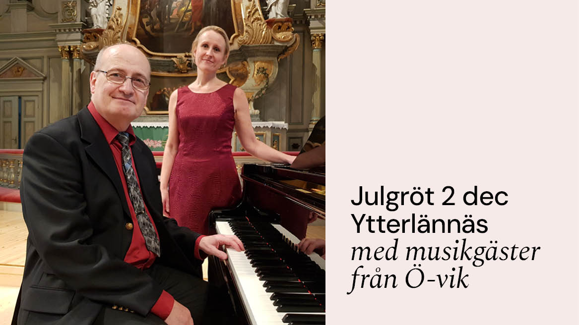 Julgröt och ljuv sång till piano med Ewa Bylin Persman och Anders Berqua Bergquist från Örnsköldsvik. Kaffekollekt till Act Svenska kyrkan. Välkomna! 14.20–15.50 · måndag 2 december