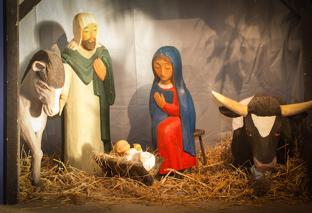 Julkrubban i Uppsala domkyrka med figurer av träkonstnären Eva Spångberg. Bild: Johan Nilsson/Ikon.