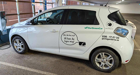 För att göra din vardag enklare och dessutom mer hållbar, har vi sedan början av sommaren 2025 inlett ett samarbete med OurGreenCar, där vi har en poolbil som är 100% eldriven. Det betyder att du som hyresgäst hos oss kan hyra en bil när du behöver det – enkelt, flexibelt och prisvärt!