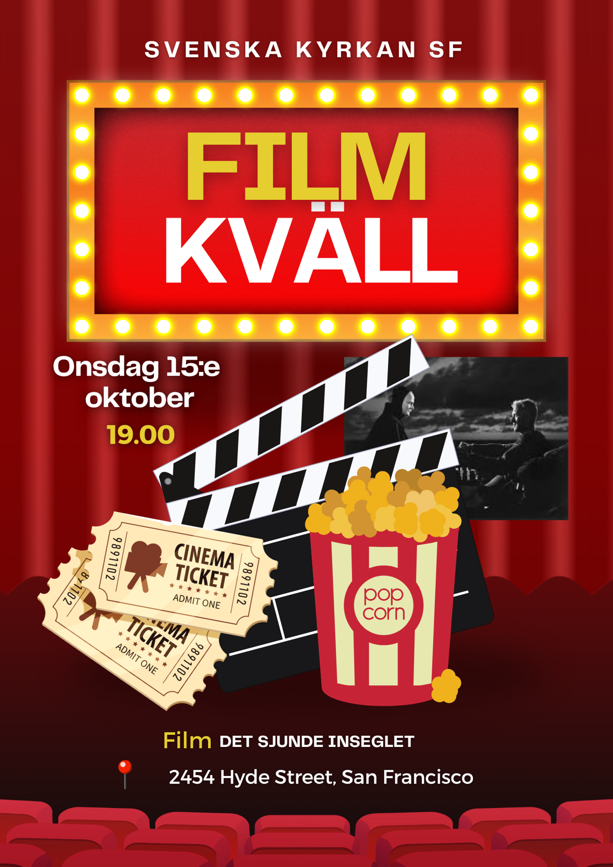 Kyrkan är öppen från 18.30. Det blir filmmys, trevliga samtal, varmkorv och popcorn. Efteråt kan de som vill stanna kvar för en kortare diskussion kring filmen.