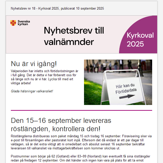 Tack för ett gott samarbete med att kommunicera kyrkovalet 2025! Valkansliet kommer att skicka en enkät för att följa upp hur insatserna har fungerat. Det är ett tips även för det lokala arbetet - följ upp, utvärdera och dokumentera inför nästa kyrkoval.