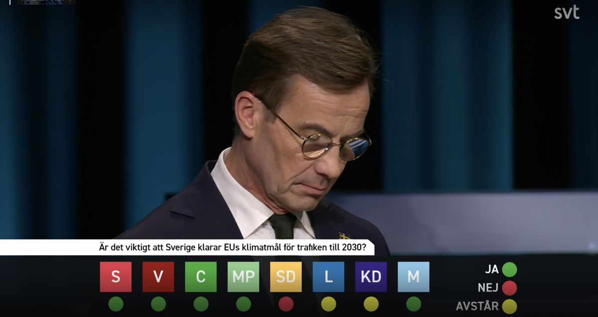 Statsministern tryckte på den gröna knappen under SVT:s partiledardebatt, och signalen var tydlig: Sverige ska klara transportsektorns klimatmål till 2030. ”Jag tror, precis som klimatminister Romina Pourmokhtari, att vi har goda möjligheter att klara det ena klimatmålet – det vill säga trafikmålet". Det följdes sedan upp av att Miljömålsberedningen i partipolisk enighet nu slår fast att det nationella 2030-målet för transportsektorn har tjänat oss väl och ska nås (SD reserverar sig dock mot målet).