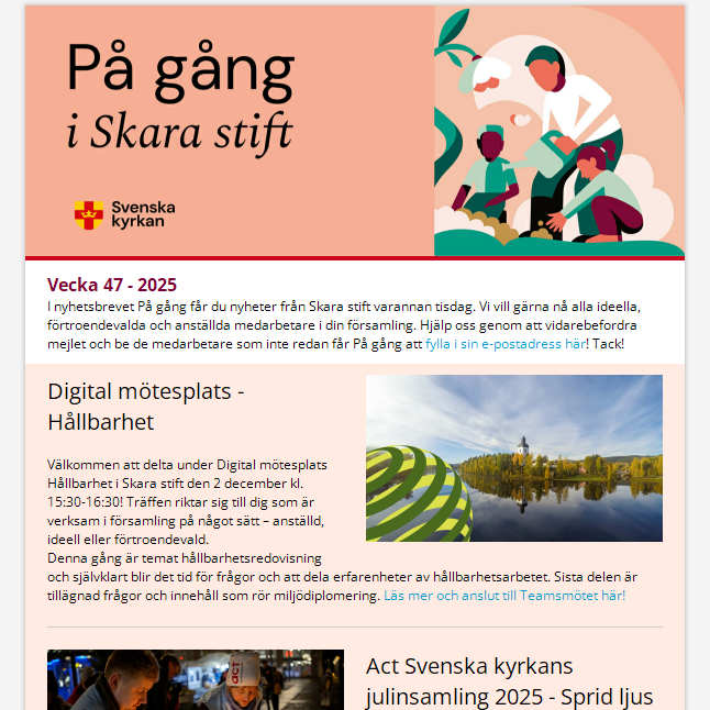 Vecka 45 - 2025 I nyhetsbrevet På gång får du nyheter från Skara stift varannan tisdag. Vi vill gärna nå alla ideella, förtroendevalda och anställda medarbetare i din församling. Hjälp oss genom att vidarebefordra mejlet och be de medarbetare som inte redan får På gång att fylla i sin e-postadress här! Tack!