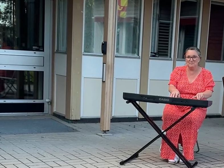 På bilden ser vi musiker Ellen, som också är ledare för Vokalensemblen och Ungdomskören, välkomna till Mikaelsgården.