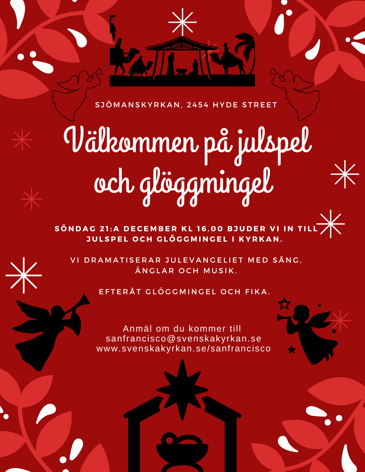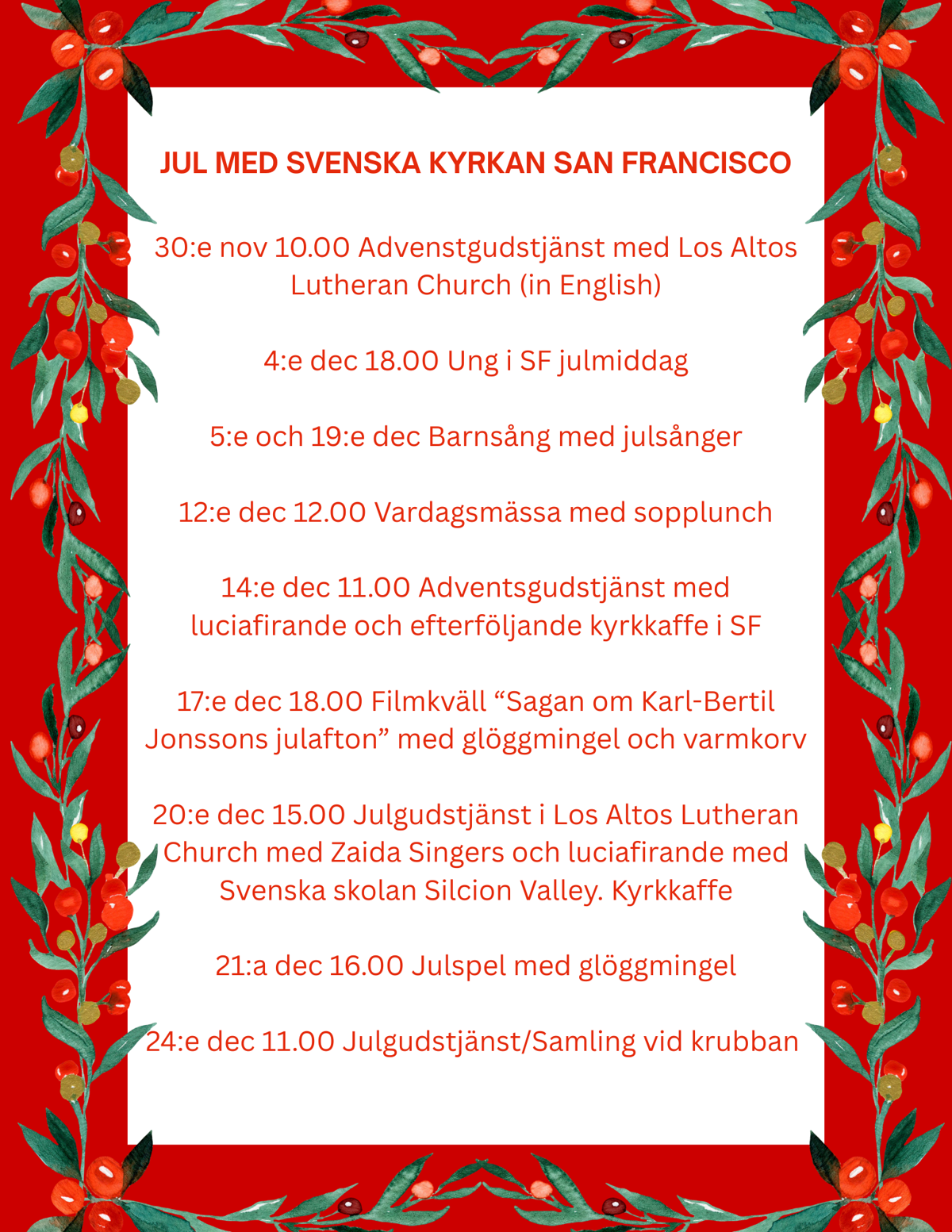 Välkommen på svensk julgudstjänst i Los Altos lördagen den 20:e december kl 15.00. Vi samlas i Los Altos Lutheran Church, 460 S El Monte Ave.