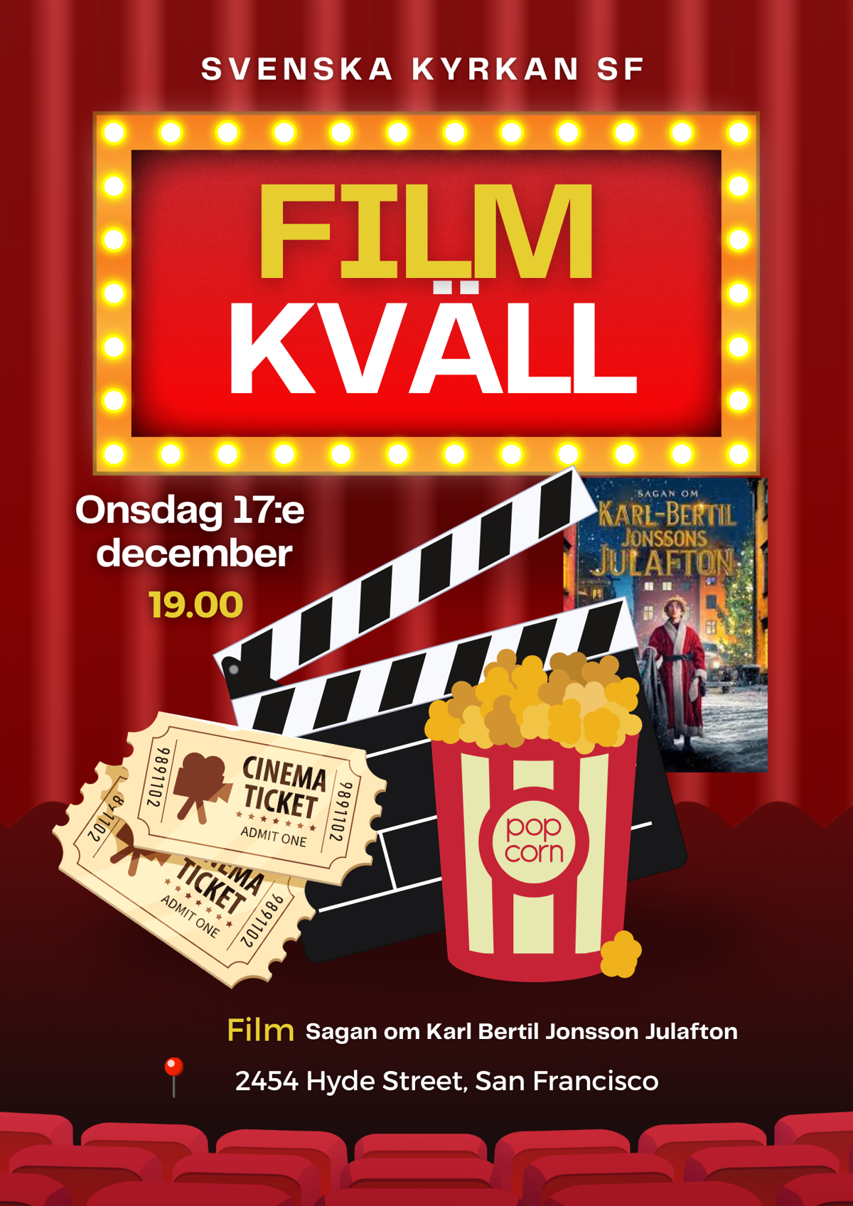 Svenska kyrkan visar nordisk film! Onsdag den 17:e december visar vi julfilmen "Sagan om Karl Bertil Jonsson julafton". Glögg, pepperkakor, varmkorv, popcorn och dryck serveras.