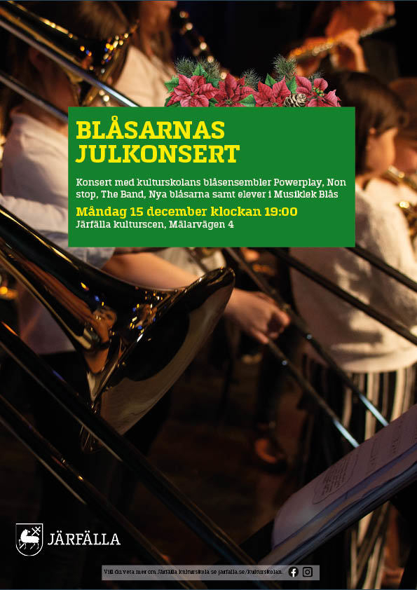 Blåsarnas julkonsertkonsert med kulturskolans blåsensembler Powerplay, Nonstop, The Band, Nya blåsarna samt elever i Musiklek Blås. När: Måndag 15 december kl. 19.00 Var: Järfälla kulturscen, Mälarvägen 4 Nycirkusföreställning Guds museumFölj med på en spännande historia skapad av Järfälla kulturskolas föreställningsgrupp i nycirkus. När: Fredag 19 december kl. 18.00 Var: Studio 1, Mälarvägen 4 Konstutställning?