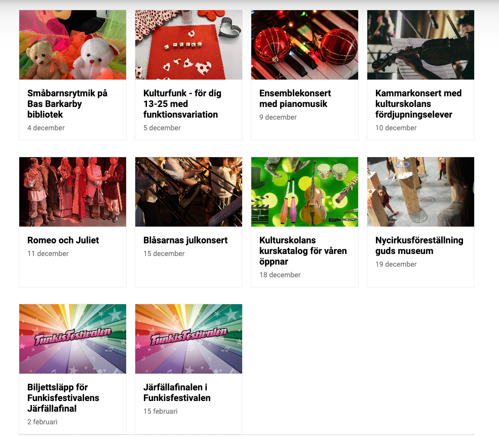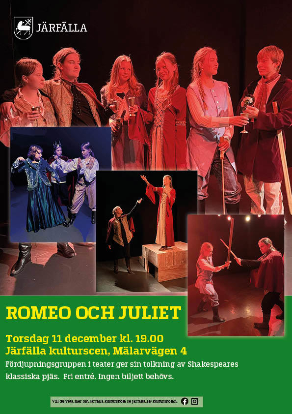 KammarkonsertFördjupningselevernas konsert där de visar upp sina färdigheter i ett varierat program med musik i olika stilar och från skilda tidsåldrar. När: Onsdag 10 december kl. 19.00 Var: Järfälla kulturscen, Mälarvägen 4 Teaterföreställning Romeo och JulietJärfälla kulturskolas fördjupningskurs i teater ger sin tolkning av Shakespeares klassiska pjäs När: Torsdag 11 december kl. 19.00 Var: Järfälla kulturscen, Mälarvägen 4 Luciadagen i Bas BarkarbyNär: Lördag 13 december