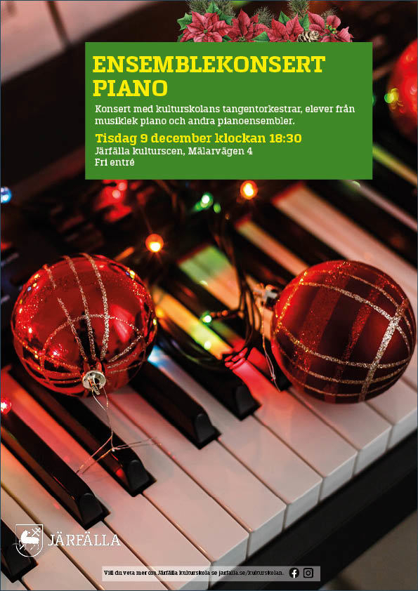 Ensemblekonsert med pianomusikKonsert på Järfälla kulturscen med kulturskolans tangentorkestrar, elever från musiklek piano och andra pianoensembler. När: Tisdag 9 december kl. 18.30 Var: Järfälla kulturscen, Mälarvägen 4