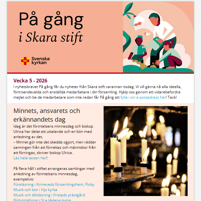 Vecka 3 - 2026 I nyhetsbrevet På gång får du nyheter från Skara stift varannan tisdag. Vi vill gärna nå alla ideella, förtroendevalda och anställda medarbetare i din församling. Hjälp oss genom att vidarebefordra mejlet och be de medarbetare som inte redan får På gång att fylla i sin e-postadress här! Tack!