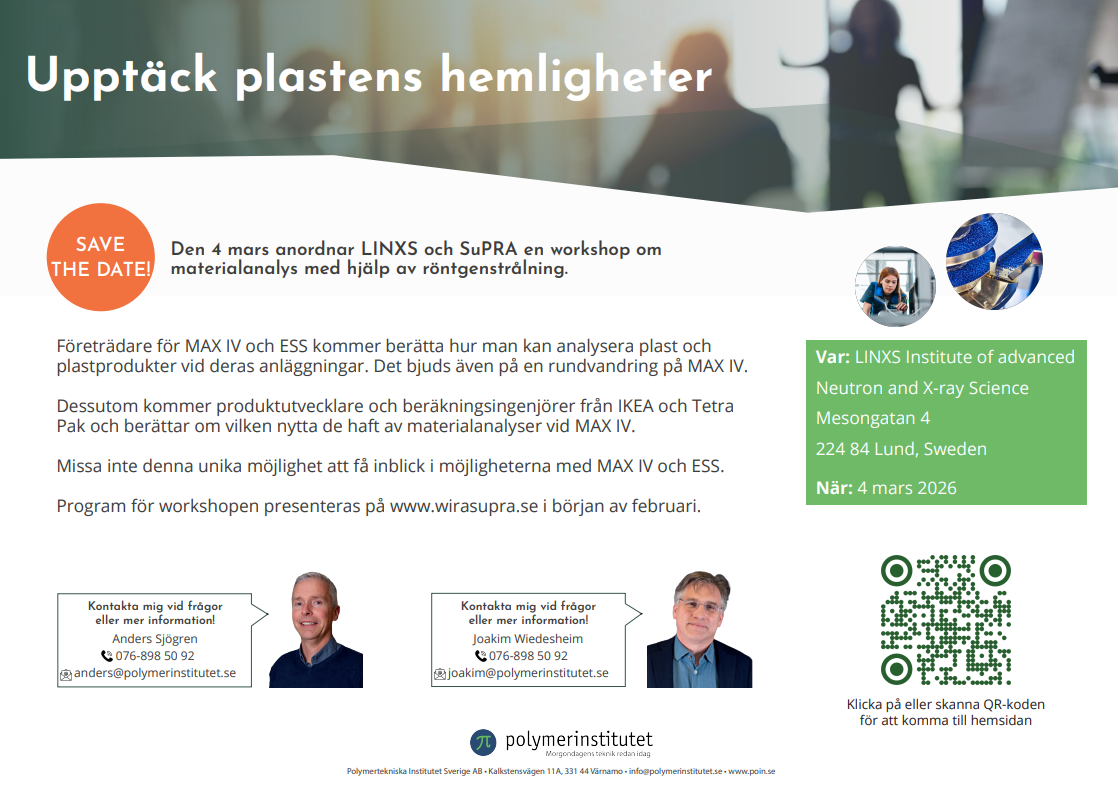 Företrädare för MAX IV och ESS kommer berätta hur man kan analysera plast och plastprodukter vid deras anläggningar. Det bjuds även på en rund-