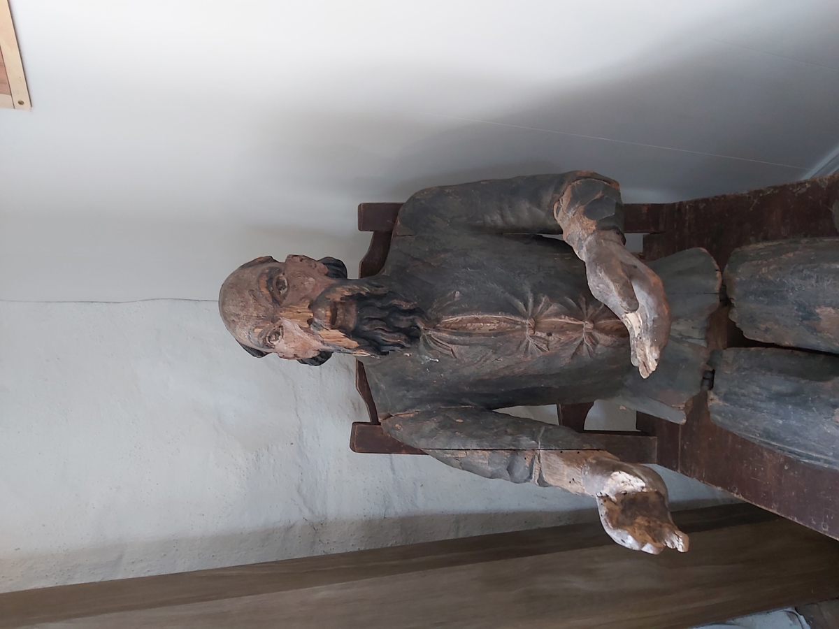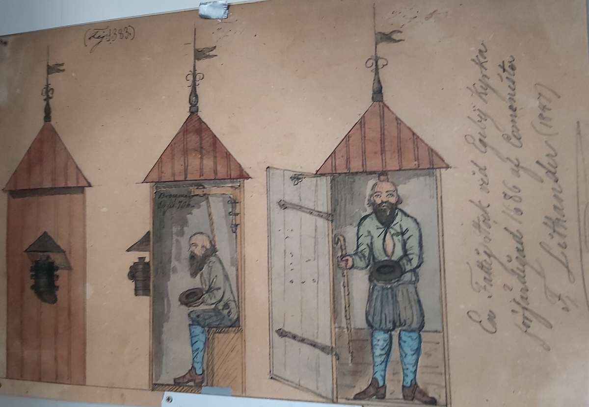 En märklig gubbe i Ekeby Känner du dig lite iakttagen när du kliver in i den rosa kyrkan i Ekeby? Inte så konstigt. För längre ner i kyrkorummet sitter en märkvärdig gubbe och tittar lite barskt på dig. Han kallas ”fattiggubben” och är snidad i trä med ledade/rörliga leder, föreställande en äldre skäggprydd man klädd i jacka, byxor och höga stövlar. Ståendes är han 148 cm hög. Från början satt han i ett litet hus på kyrkvallen och när någon öppnade dörren, reste han sig upp med hjälp av en enkel mekanik med rep och trissor och stäckte fram sin hatt/hand. Man kunde även lägga i en slant i en bössa på husets utsida, om man inte vågade öppna dörren. Tillverkningsår på honom är 1686, så man får kalla honom för en ”gammal gubbe”. Det finns en ritning på både gubben och hans lilla hus av folklivsforskaren Nils Månsson Mandelgran från 1847. Mandelgren ansåg att ”gubben” tillverkades av komminister Lithander, men andra uppgifter pekar på Bildhuggaren Johan Werner skulle ha tillverkat honom. Så vi kan nog med säkerhet säga att Komminister Lithander åtminstone skaffade honom till kyrkan… men historien stannar inte där. Gubben har varit på villovägar, då han 1817 såldes på auktion, men lyckligtvis hittade han hem till kyrkan igen 1926. Enligt C.F. Broccman ska det på 1700-talet ha funnits följande text på huset: ”Af träd och stock här inne sitter Jag i en mörk och liten wrå. För fattigt folk jag pengar tigger Af then mig ser och förbi går. Ty slut nu intet hjertat till så framt du bär Guds kärleksbild.” Historien om fattigbössor och fattiggubbar I alla tider har de människor som sökt skydd och stöd, tagit hjälp av sin släkt och familj. Men för de som stod utanför dessa skyddsnät, gavs en tiggarbricka till den fattige. När tiggarbrickan visades upp, kunde de tas om hand runt om i gårdarna. Storleken på gårdens jord, delades i rotor så de fattiga och sjuka fick gå sk. ”rotegång” mellan socknens gårdar. En fattigklubba/fattigkavle skickades mellan gårdarna för att förvarna om att de skulle bjuda på mat och husrum till en fattig. Socknen och kyrkan hade ett gemensamt ansvar för de fattiga, sjuka och föräldralösa. Under 1800-talet ändrades ”rotegången” till att de kunde få plats i en fattigstuga, som oftast låg i närheten av kyrkan. Kollekt samlades in i kyrkorna till de fattiga, och det märktes tydligt av vid stora högtider, då människor var mer givmilda. Små bössor sattes sedan upp utanför kyrkorna, för en mer permanent insamling. Fattigstockar och fattiggubbar har funnits både i Sverige och Finland, men under Gustav Vasa (1544) förbjöds dessa. Fattigbössorna hittade tillbaka och blev vanligare igen på 1600-talet. /Anne-Sofie Tengstrand