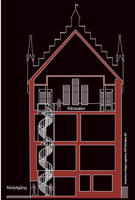 I Roggeborgen är bygget av en ny utrymningstrappa i slutfasen. När trappan är klar går det att vara betydligt fler i Rikssalen på översta våningen än dagens 15 personer. Kanske kan det bli kammarkonserter där igen? Statens fastighetsverk förvaltar och Kungliga bilioteket hyr Roggeborgen.
