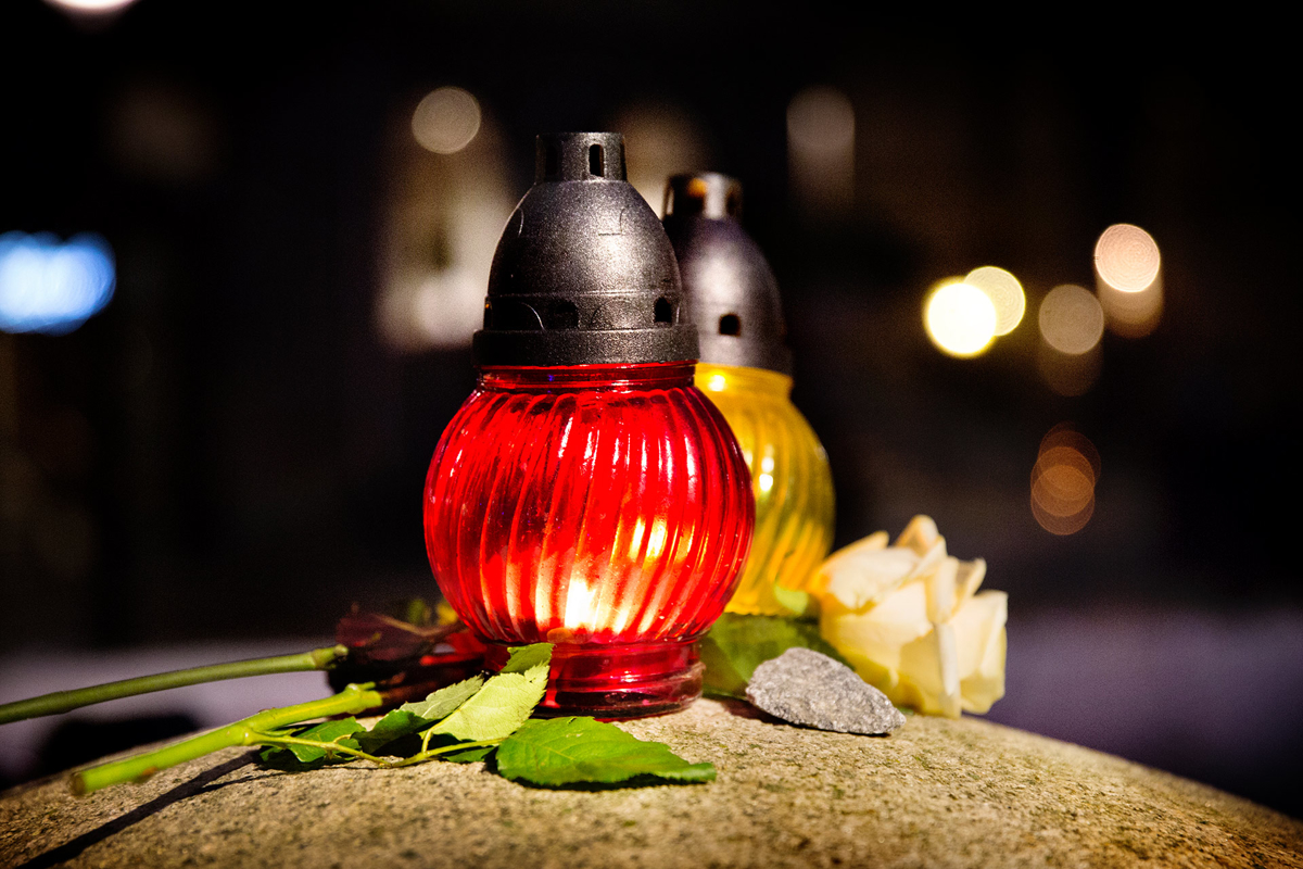 Ljuslyktor och rosor på Raoul Wallenbergs minnesmonument.