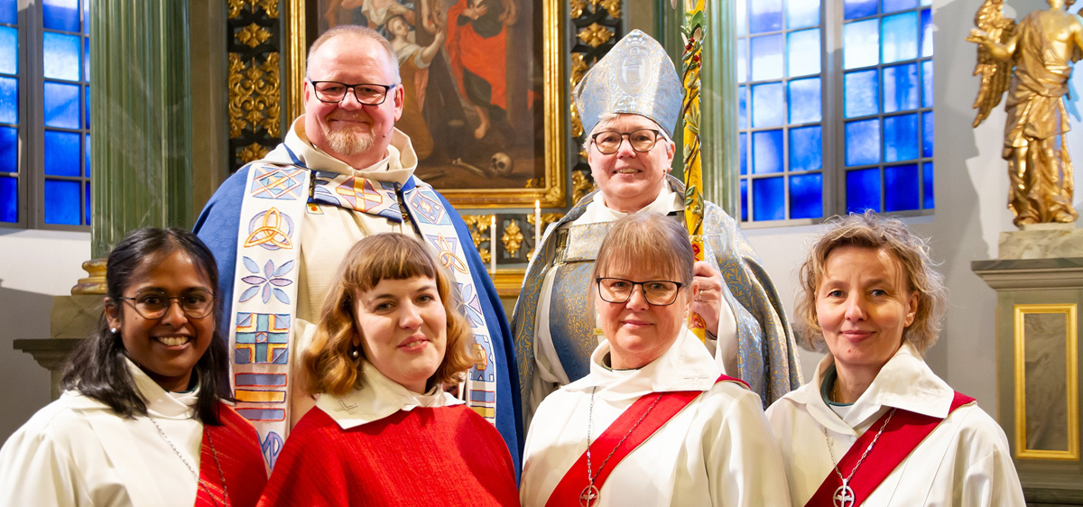 Från söndagens präst- och diakonvigning, övre raden: Domprost Kent Nordin och biskop Eva Nordung-Byström. Nedre raden från vänster: Praba Singham, diakon, Noómi Hessel, präst, Elenor Andersson, diakon och Helena Näsström, diakon.