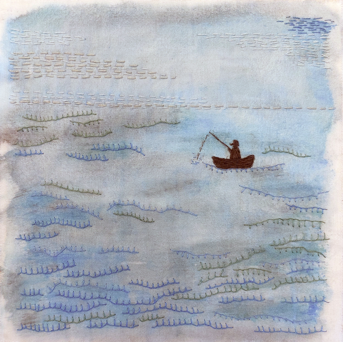 Broderi ur utställningen Vatten/vattenreflektioner på Kultur på Slottet, Halmstad Slott