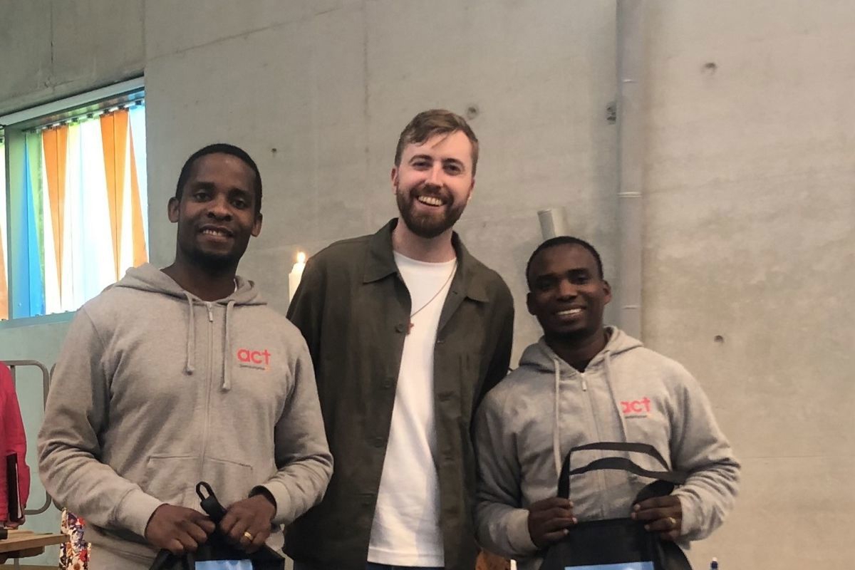 Peter och David från Tanzania med handledare Joakim Winbom i värdförsamlingen Sollentuna 2025. Foto: Joakim Winbom