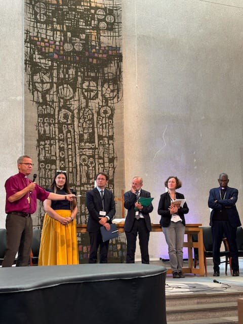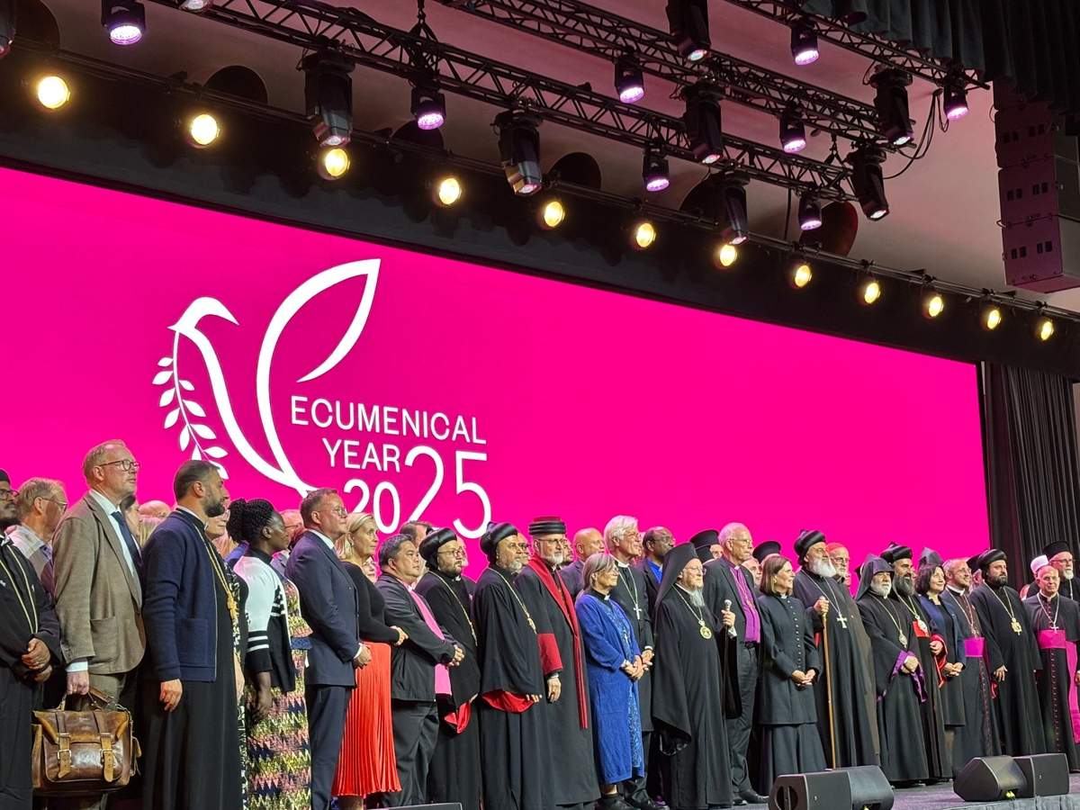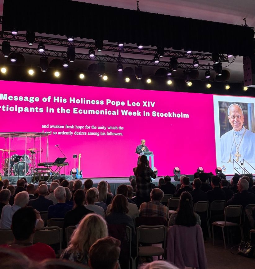 Meddelande från Påve Leo XIV under det ekumeniska firandet i Filadelfia Convention Centre. Foto: Ulrica Hansson