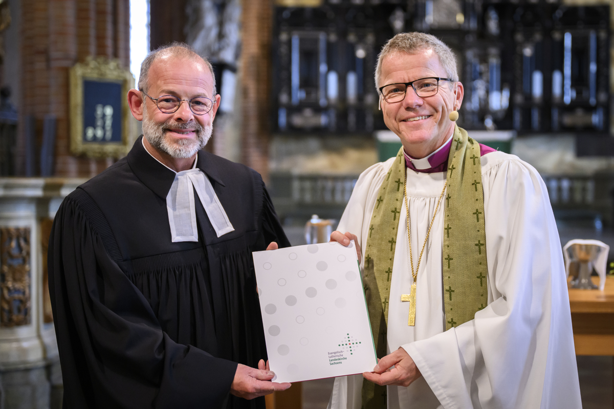 Superintendent Albrecht Nollau och biskop Andreas Holmberg med en hälsning från biskopen Andreas Piltz, evangelisk-lutherska kyrkan i Saxen. Foto: Magnus Aronson/Ikon