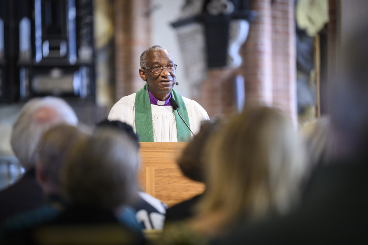 Biskop Fredrick Shoo predikar under stiftsmässan i Storkyrkan. Foto: Magnus Aronson/Ikon
