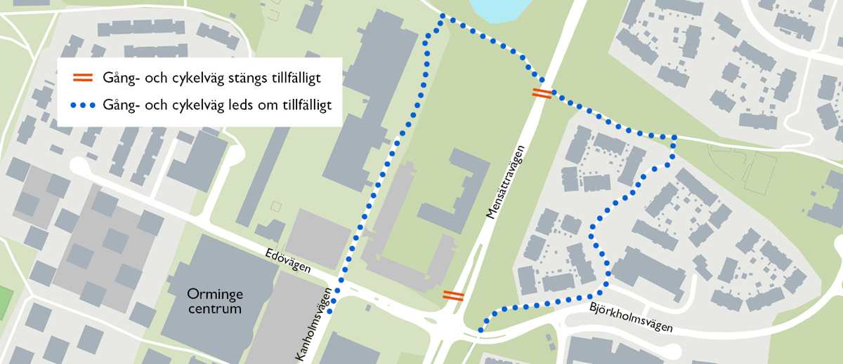 Under arbetet leds gång- och cykeltrafik vid Mensättravägen om under vardagar klockan 09.00–16.00 Arbetet är en del av grundläggningen för nya gator och kvarter i Orminge centrum. Beräknas vara klart i slutet av december.