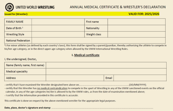- Läkarintyg ”2025-2026 UWW Medical Certificate and Wrestlers Declaration” (gäller alla brottare, finns bifogat)