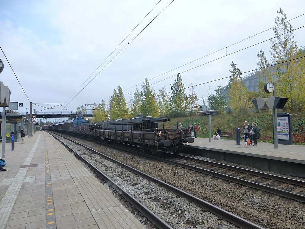 | Godstog på Ørestad Station. Foto: Wikimedia Commons, Leif Jørgensen |